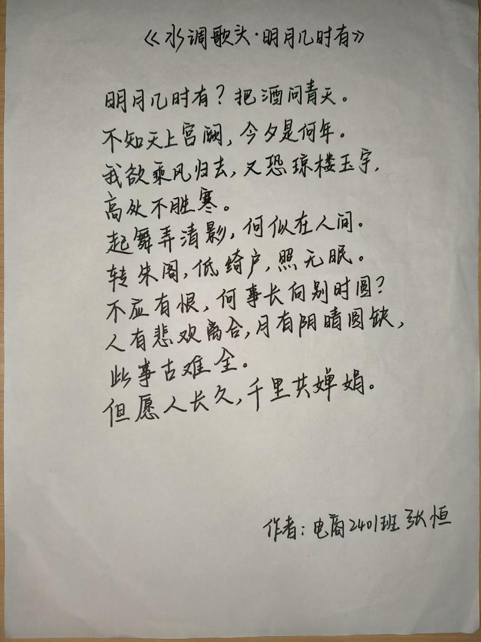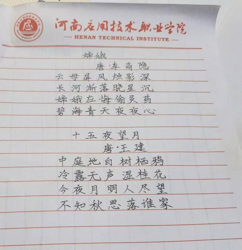 活动现场,学子们以笔为媒,将中秋元素与青春感悟融入创作。手抄报比赛中,同学们围绕“中秋传说”“家国情怀”主题展开构思,以细腻笔触勾勒嫦娥奔月、玉兔捣药的经典场景;书法比赛现场则墨香四溢,软笔组学子挥毫泼墨,“中秋安康”“喜乐团圆”等词句在宣纸间流淌,硬笔组作品则以工整笔触展现青年的严谨与朝气,一幅幅作品既饱含对传统节日的敬意,更传递出新时代青年的精神风貌。