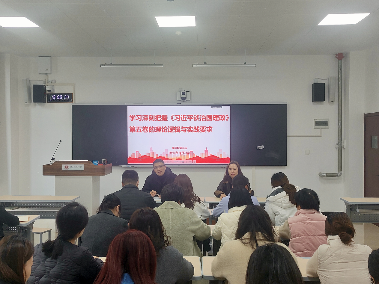 随后,贺苗苗围绕“深刻把握《习近平谈治国理政》第五卷的理论逻辑与实践要求”作专题分享。从理论逻辑层面,阐述了该著作与马克思主义中国化时代化最新成果的一脉相承与创新发展;从实践要求层面,结合教育领域实际,提出要将著作中的方法论转化为推动教学改革、落实立德树人任务的具体举措,例如在专业课程中融入中国式现代化案例,引导学生树立服务国家发展的意识。