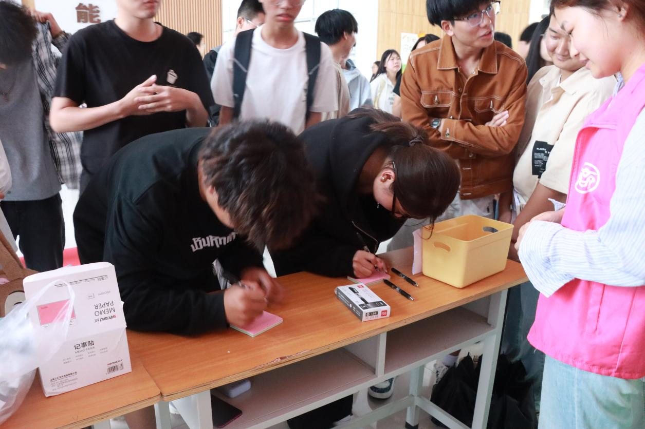 更受新生欢迎的“情绪盲盒”环节,设置了“困惑盲盒”与“解惑盲盒”两大区域。在“困惑盲盒”前,新生们拿起笔,将自己关于学业压力、社团选择、宿舍相处等方面的困惑匿名写下并投入盒中;而在“解惑盲盒”处,学长学姐与老师提前写下的经验妙招、暖心鼓励便成了“宝藏”,新生随机抽取,收获针对性的解决方案与情感支持。现场不少新生表示,通过抽取“解惑盲盒”,不仅找到了应对困惑的方法,还感受到了sunbet大家庭的温暖,原本的焦虑感减轻了许多。
