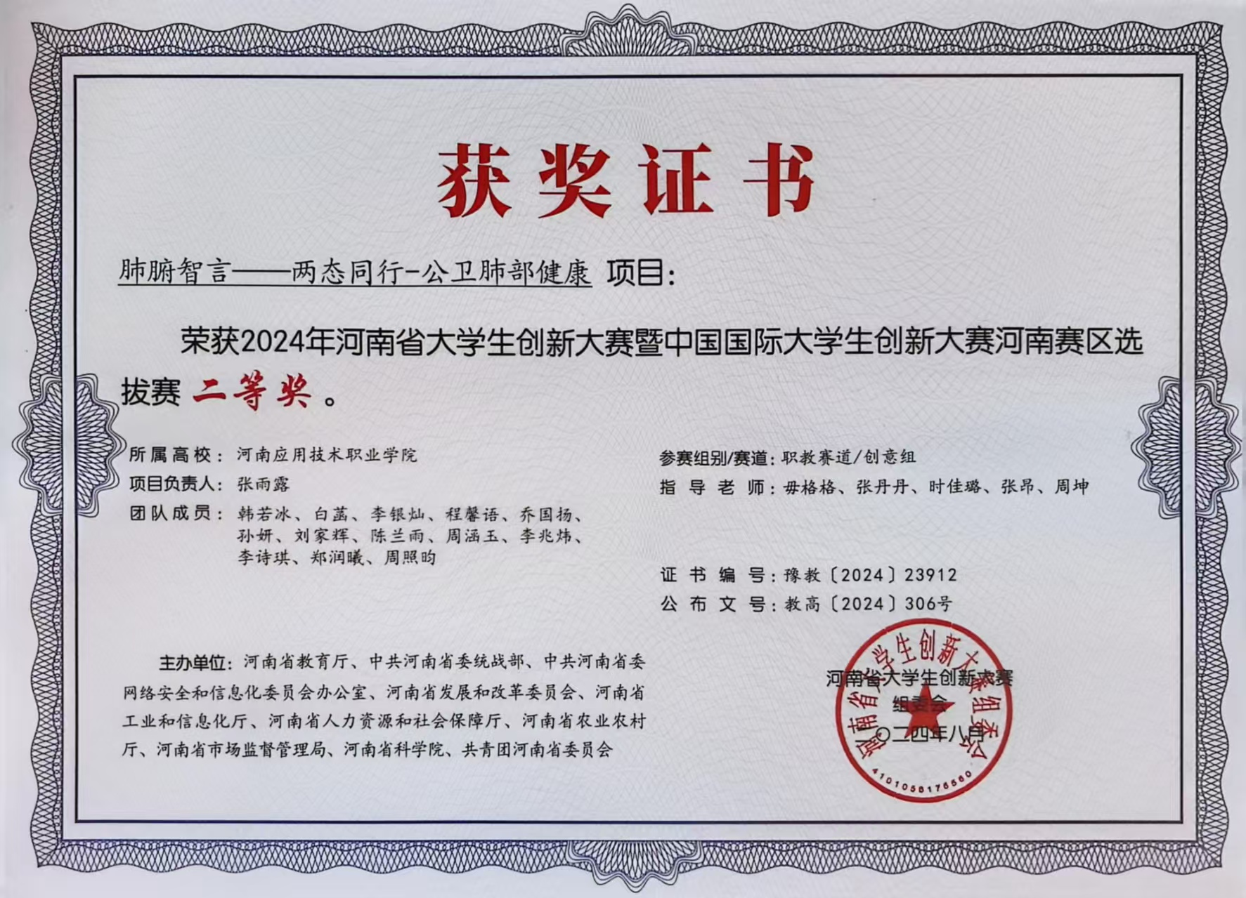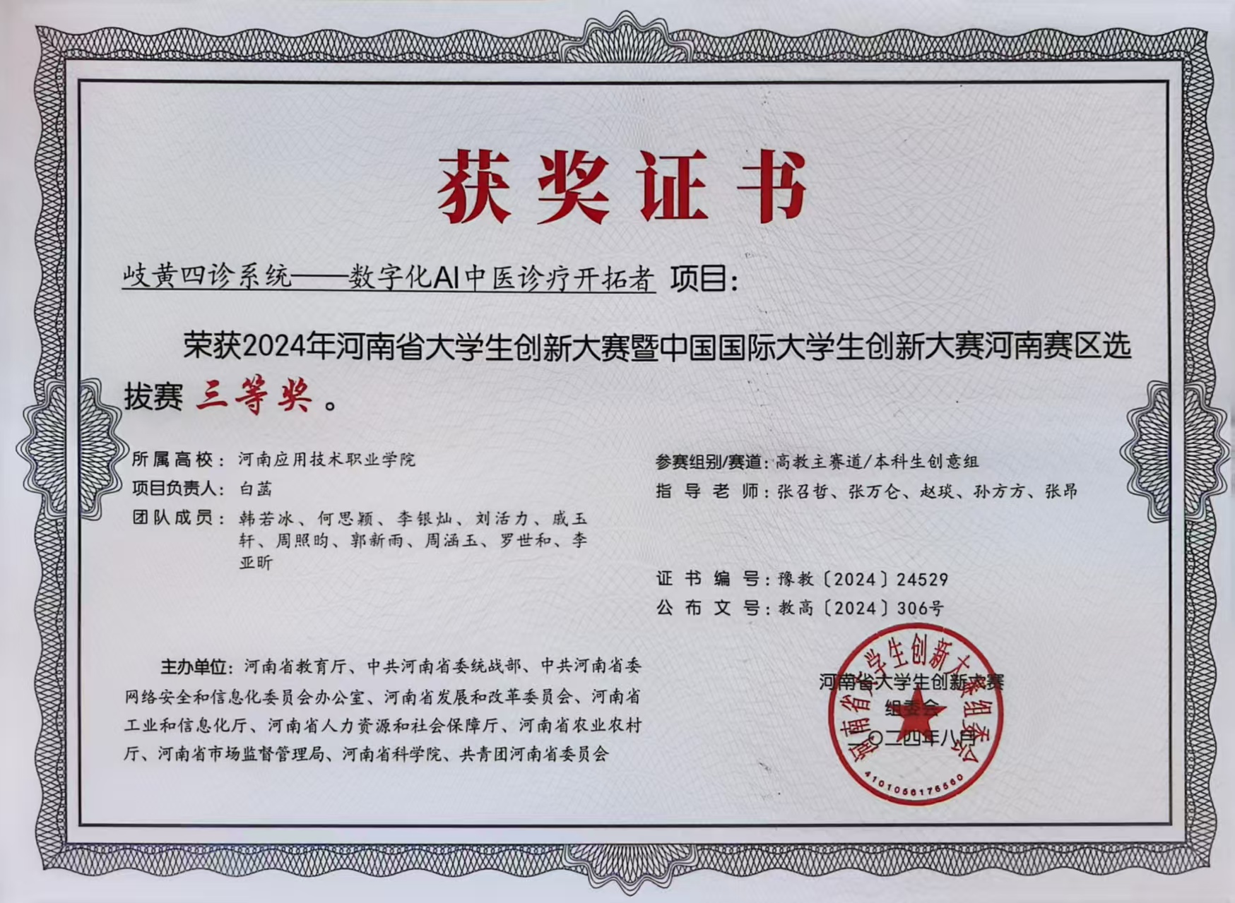 在河南省大学生创新大赛暨中国国际大学生创新大赛中,她双线发力、收获颇丰:参与《肺腑智言——两态同行-公卫肺部健康》项目时,聚焦大众肺部健康管理意识薄弱、筛查便捷性不足等痛点,协助团队设计分层调研方案。她和队友分工走进多个社区居委会和养老服务中心,通过问卷填写、一对一访谈的方式,通过与不同群体沟通,详细记录大家对肺部健康措施的需求,累计收集有效反馈80余条,整理形成调研分析报告,为项目确定“社区科普+便捷筛查+跟踪管理”的核心框架提供了直接依据,助力项目荣获河南赛区选拔赛二等奖;领衔《歧黄四诊系统——数字化AI中医诊疗开拓者》项目时,她牵头梳理传统中医诊疗流程的痛点,结合数字化技术应用场景,带领团队搭建项目初步框架。从中医脉诊数据的数字化采集方案,到AI辅助诊断模型的适配逻辑,她多次带着草稿向专业教师、中医馆从业者请教,针对“数据准确性”“临床实用性”等问题反复讨论,先后调整优化项目技术路径、操作流程等核心内容,逐步解决数字化工具与中医诊疗场景适配的难点,最终斩获河南赛区选拔赛三等奖,展现了将专业思维转化为实践方案的扎实能力。