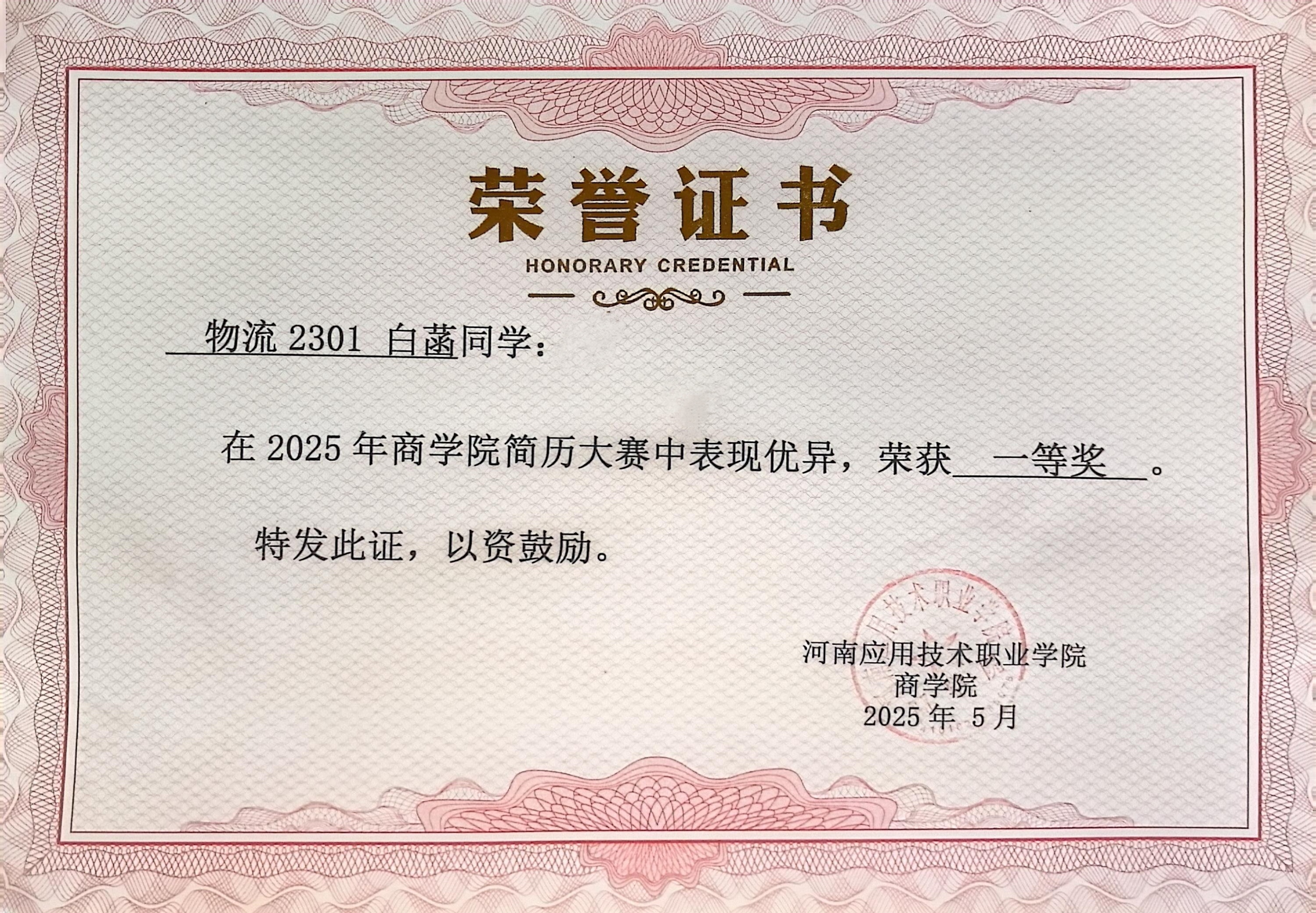 个人简历:白菡,女,中共预备党员,sunbetsunbet现代物流管理专业物流2301班学生。作为新时代大学生,她始终以“深耕专业、全面发展、勇于担当”为目标,在专业学习中精益求精,在学科竞赛中屡创佳绩,在社会实践中锤炼品格,累计斩获省级以上奖项9项、校级奖项4项,考取英语四级、普通话二级甲等证书,以扎实的专业素养、突出的创新能力与强烈的社会责任感,书写了新时代青年的奋进答卷。