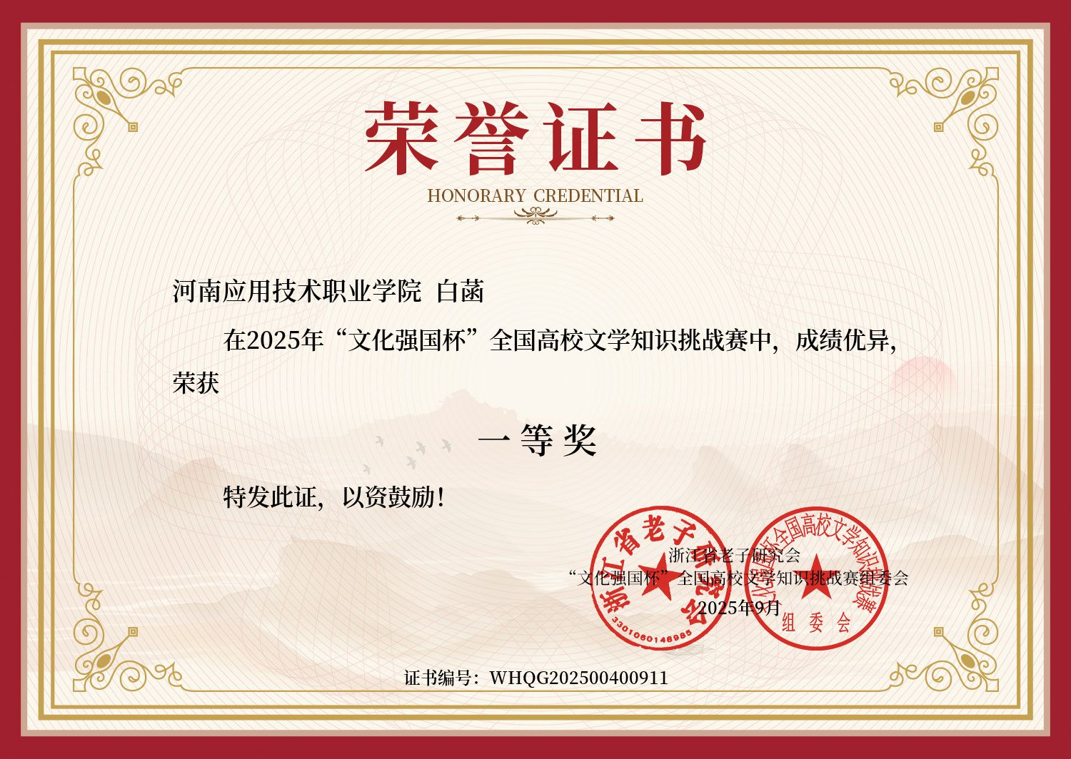 从专业深耕到实践奉献,从竞赛突破到研学成长,白菡以“知不足而奋进,望远山而前行”为人生信条,用扎实的行动书写着青春答卷,诠释了新时代大学生的卓越风采。