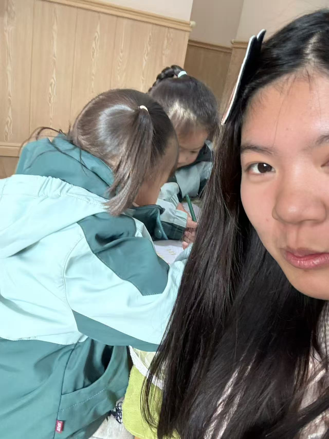 起初我以为“看小孩”只是简单地看管,但很快发现这份工作需要极大的耐心与共情。当扎羊角辫的小女孩把画着太阳的作品塞给我,当沉默的小男孩悄悄递来爱心贴纸时,我意识到自己的陪伴已经走进了他们的心里。