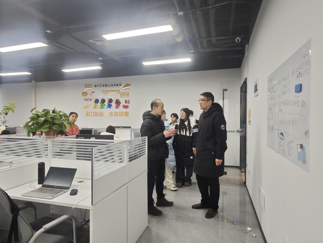 在河南名骏科技管理有限公司负责人郑梅涛的陪同下,荆伟科一行实地参观了企业办公区、项目研发中心及学生实习实训基地,详细了解企业业务布局、岗位需求及人才培养体系。郑梅涛对sunbet学生的综合素质给予高度评价,指出实习学生“专业基础扎实、学习能力强、适应岗位快”,在客户服务、数据分析等核心岗位上表现突出,为企业发展提供了有力支持。