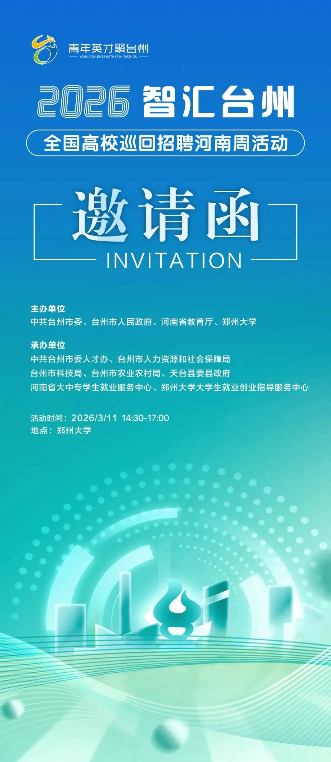 为搭建豫浙人才交流合作平台,促进我省高校毕业生高质量充分就业,由河南省教育厅联合中共台州市委、台州市人民政府、郑州大学共同主办,河南省大中专学生就业服务中心、台州市人力资源和社会保障局等单位承办的2026“智汇台州”全国高校巡回招聘河南周活动启动仪式暨首场招聘会,将于3月11日14:30-17:00在郑州大学正式启动!